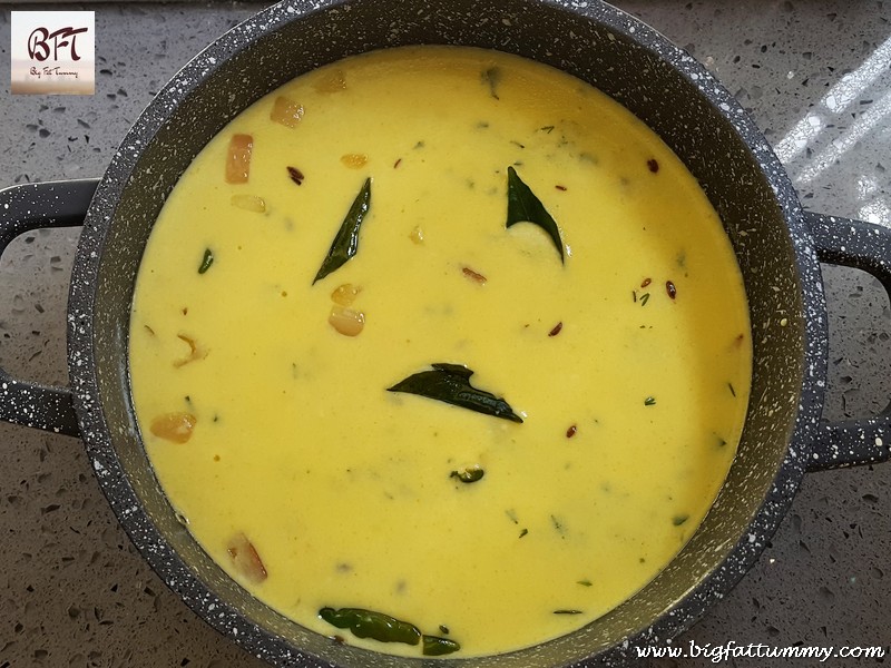 Step 1: Take the curds in a bowl and add 400 ml water. Add the turmeric and hing and whisk till smooth. Keep aside. Crush the garlic lightly using a pestle.