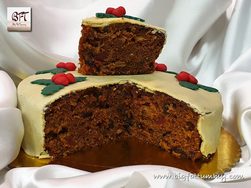 • Covering / decorating the cake with marzipan is optional. If you choose to decorate, you could also boil ¼ cup sugar in ½ water till the sugar dissolves completely. Then cool and brush on the marzipan to give it some sheen / gloss.