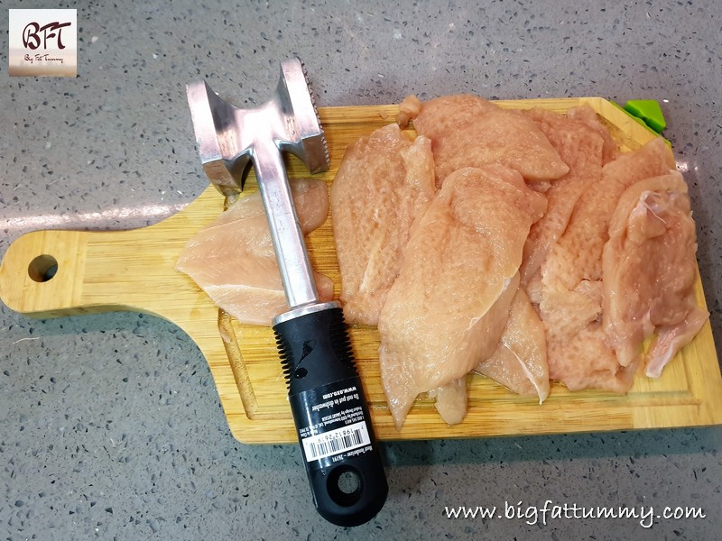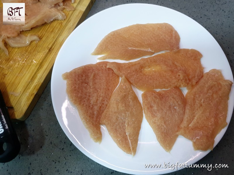 Step 1: Slice the chicken breast into steaks. Then use a meat mallet and flatten lightly (be careful not to tear the meat).