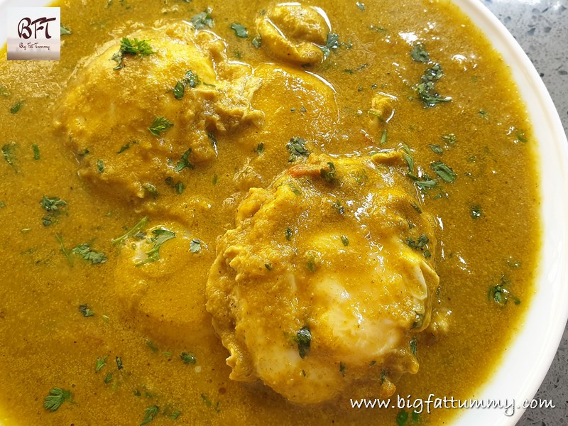 The Egg Masala Curry is a poached egg curry. It is distinct from the Goan Egg Drop Curry (click here) or the Egg Xacuti Curry (click here) because it uses ready masala powders and is flavoured with green corriander. No stock cubes are used to flavor the curry.