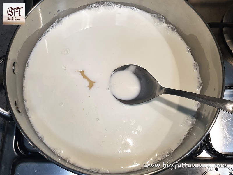 Step 2:     Heat the milk, condensed milk and milk cream till hot, on medium heat (do not bring to a boil). Switch off the heat.