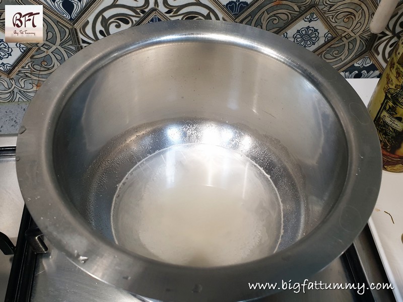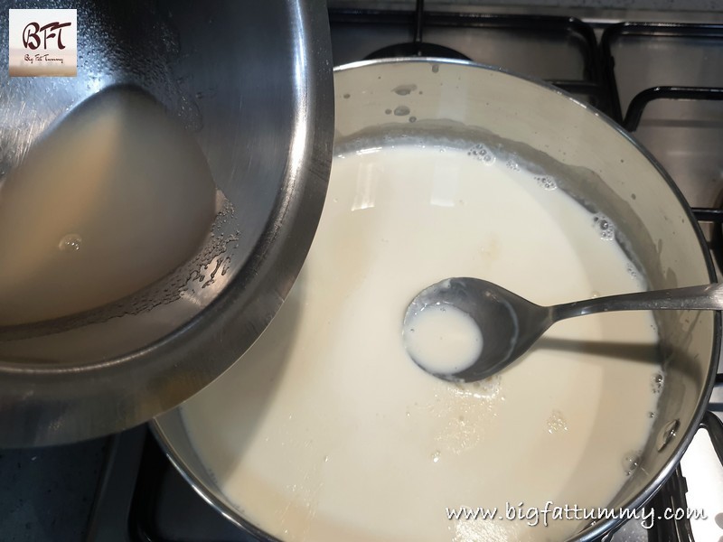 Step 3:     Add 1/3 cup water to another vessel and add the agar-agar powder to it. Then place the vessel on low heat and mix till it melts completely (the liquid is transparent). Add this to the hot milk-milk cream mixture and mix well. Let it cool for 3 to 4 minutes.