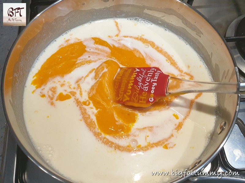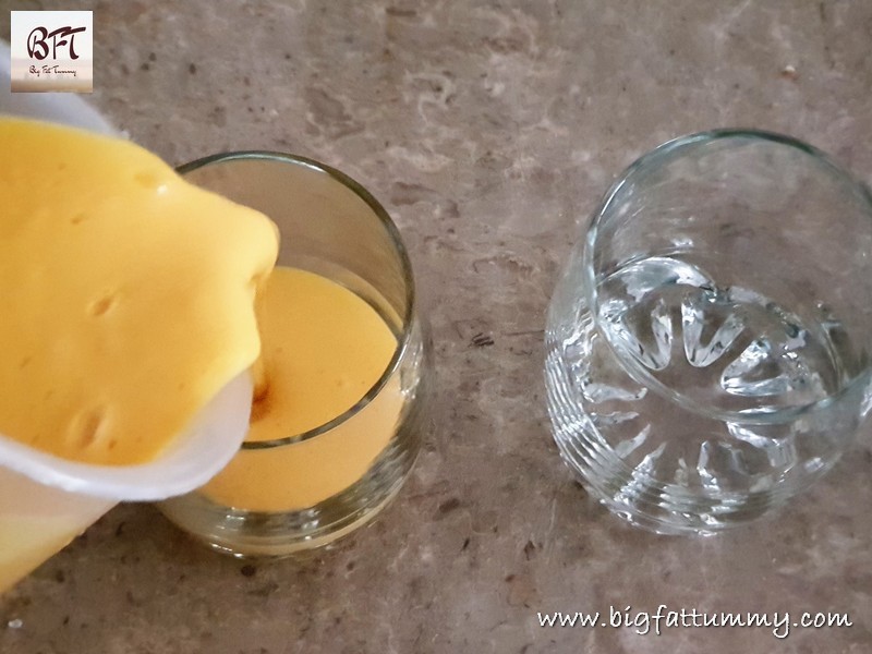 Step 4:     Now add the mango puree and mix well. Pour into individual serving bowls / glasses and allow to cool completely. Then cover with foil and keep in the refrigerator. Serve chilled.