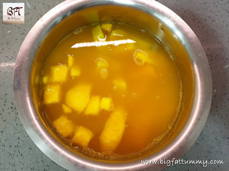 Step 2:     Take a pan and add 1 litre water and the ripe and raw mango pieces to it. Cook half covered on medium heat for 35 minutes till the mangoes are cooked. Then allow to cool completely.