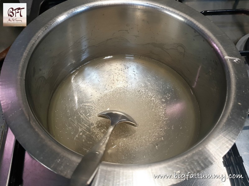 Step 3:     Take the sugar and 2 cups water in another pan and place on heat. Stir till the sugar dissolves and then switch off the heat and allow to cool completely (this step is only to melt the sugar).