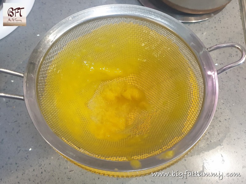 Step 4:     Puree the cooked mango pieces with all its liquids. Then sieve the puree into another clean bowl / vessel. Now strain in the cooled sugar syrup into it. Mix well. Keep the drink in the refrigerator. Serve chilled with ice cubes.