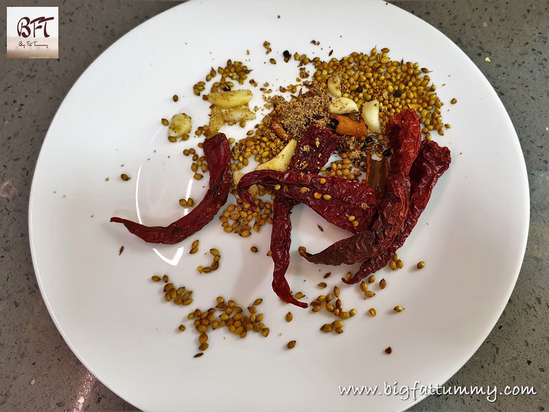 Step 2: Dry roast each spice separately and keep aside (1 to 7 in Masala Paste). Then add ½ tsp. oil and roast the garlic and keep aside. Then grind all the spices with the garlic, turmeric, tamarind and a little water to a fine paste.