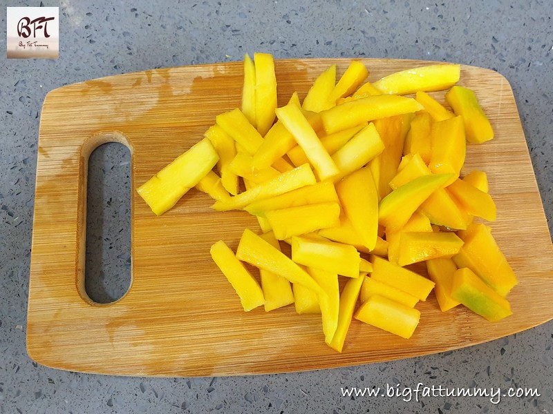 Step 1: Wash, dry and peel the mangoes. Cut into small pieces as shown in the picture (discard the seed or use in any of these curry).