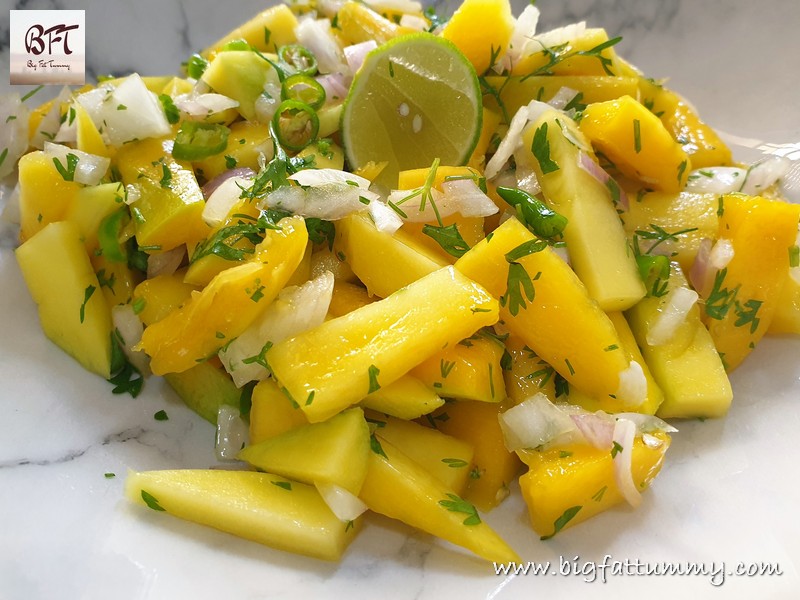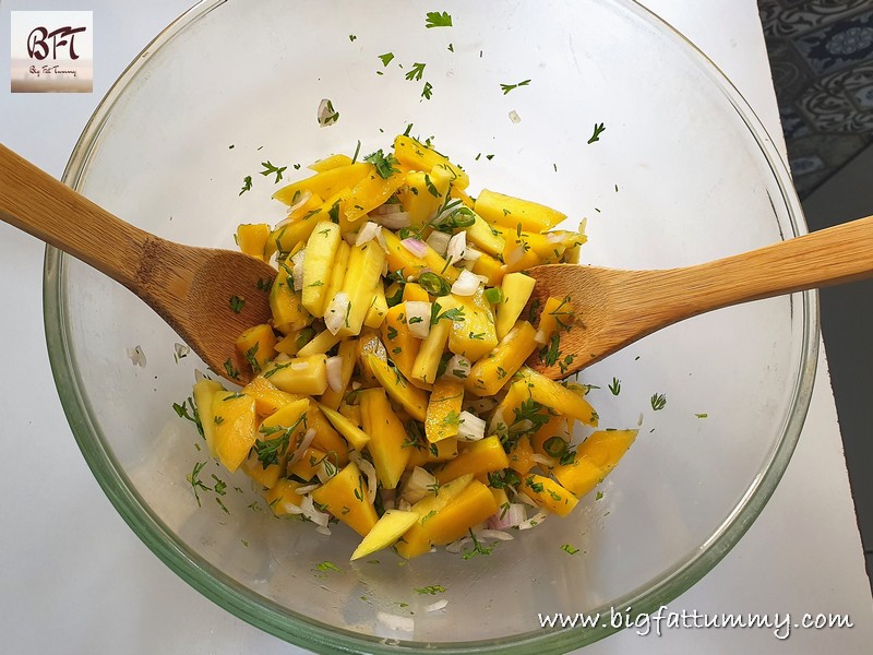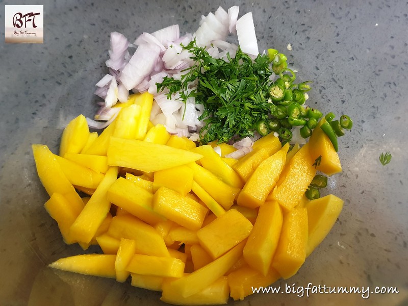 Step 2: Take the mango pieces in a salad bowl and add the chopped onion, chillies, green corriander, lime juice and salt. Toss well using salad spoons and the let it rest for 30 minutes before serving.