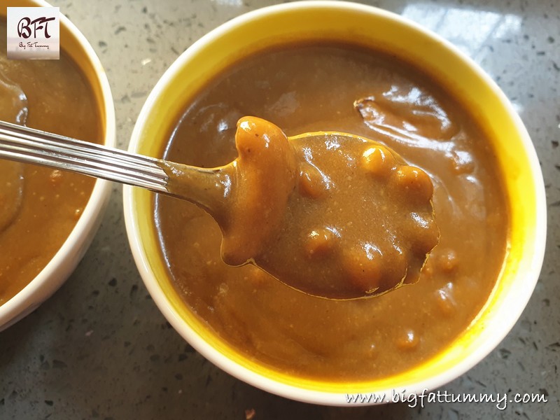 Soji / Vonn is a Goan sweet which is kind of like a gruel or porridge. It is made with split chickpeas, rice flour, palm jaggery and coconut milk. It is also made with boiled wheat in place of the gram. When made with wheat, this preparation is called Kazaranchem Soji (wedding sweet) and is served to guests at a pre-wedding feast known as bhikracheam Jevon. I remember my maxen (aunty) preparing a huge potful for my pre-wedding bhikracheam Jevon way back in 2007. The Soji / Vonn was also made at home when the Church observed Santos Passos (a religious pious exercise which included a procession) and on Palm Sunday. The palm jaggery and the coconut milk are the main ingredients that add flavor to this delectable dessert. Cashew nut pieces or bibes (raw cashew nut) is also added to the vonn and adds to the goodness.