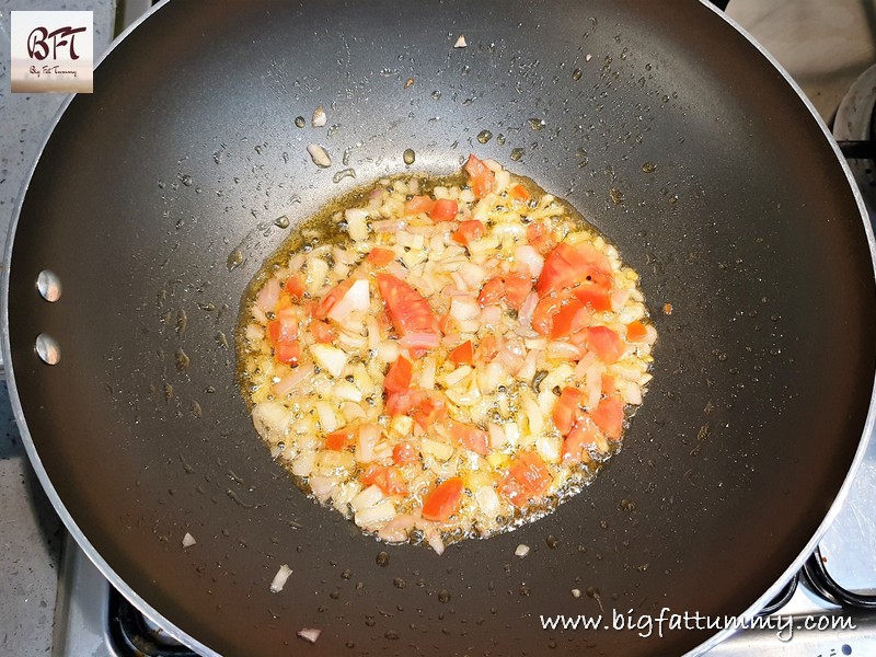 Step 2: Heat the oil in a pan and sauté the onions till soft. Add the tomato and cook for 2 minutes.