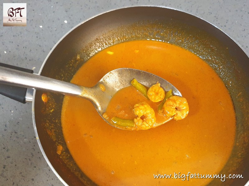 Step 5: Finally add the prawns and green chillies and cook for 2 to 3 minutes. Check for salt and add if required and the switch off the heat and keep covered for 5 minutes before serving.
