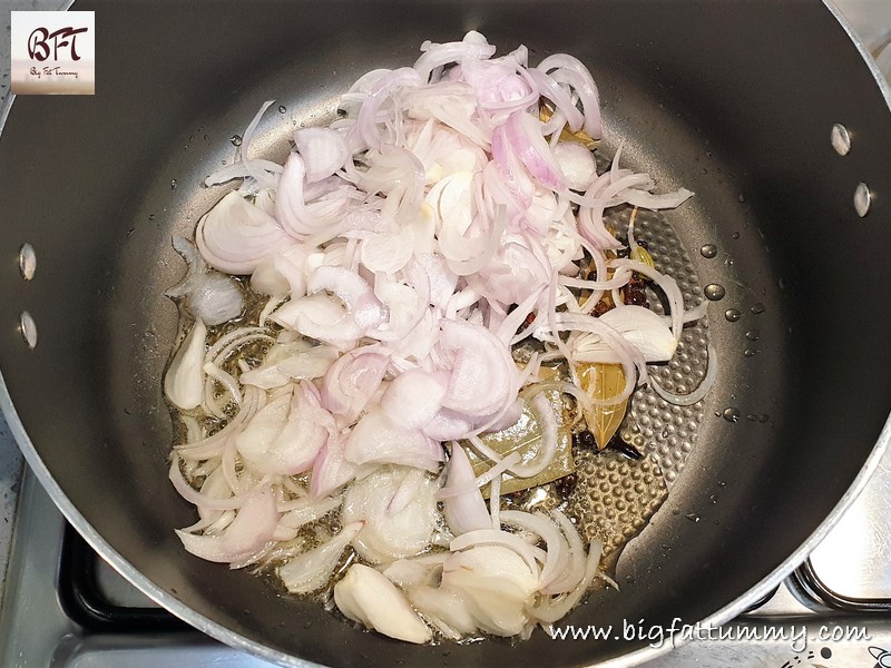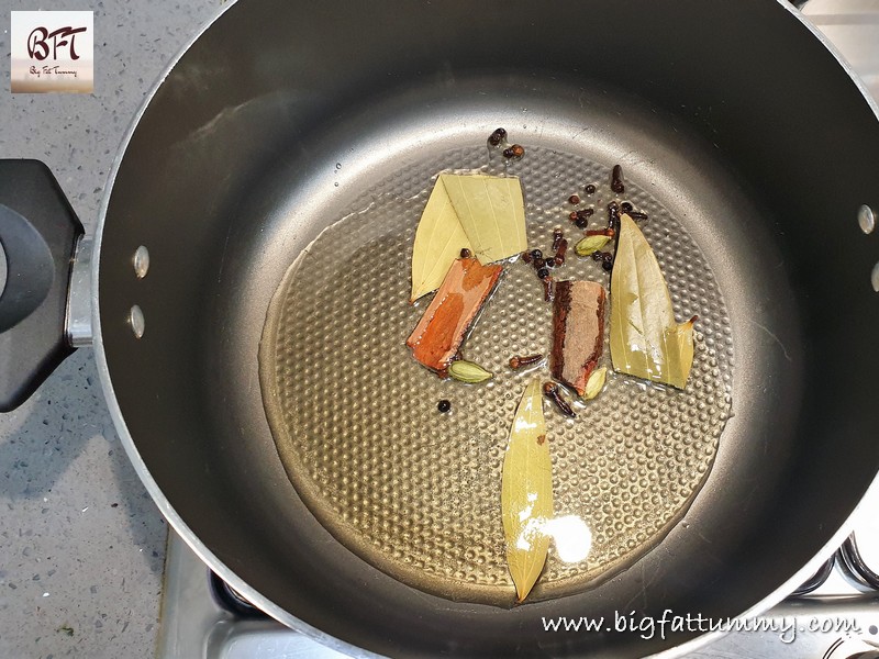 Step 3:     Meanwhile, take a utensil large enough to prepare the pulao. Place it on heat and add 5 tbsp. oil. Add the bay leaves, cloves, cardamoms, cinnamon and black pepper corns. Stir for a few seconds on medium heat and then add the sliced onions. Sauté the onions till soft.
