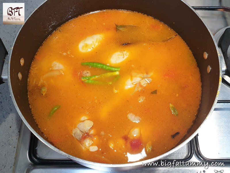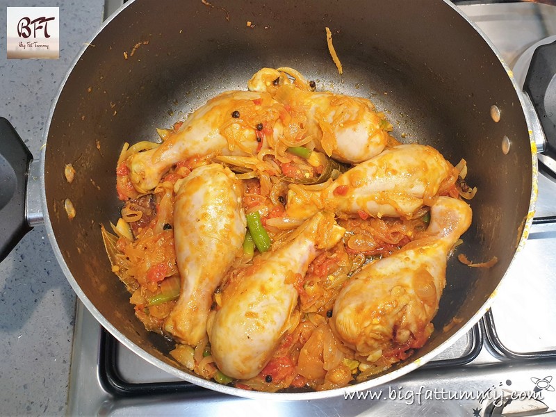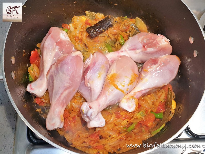 Step 6:     Next add the chicken and sauté till the pieces change colour.