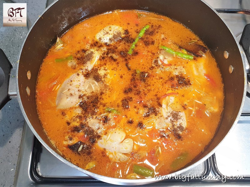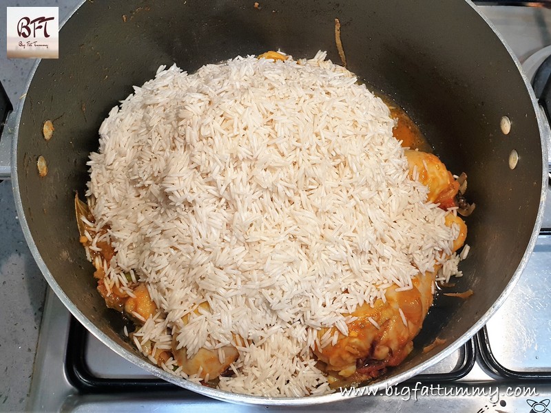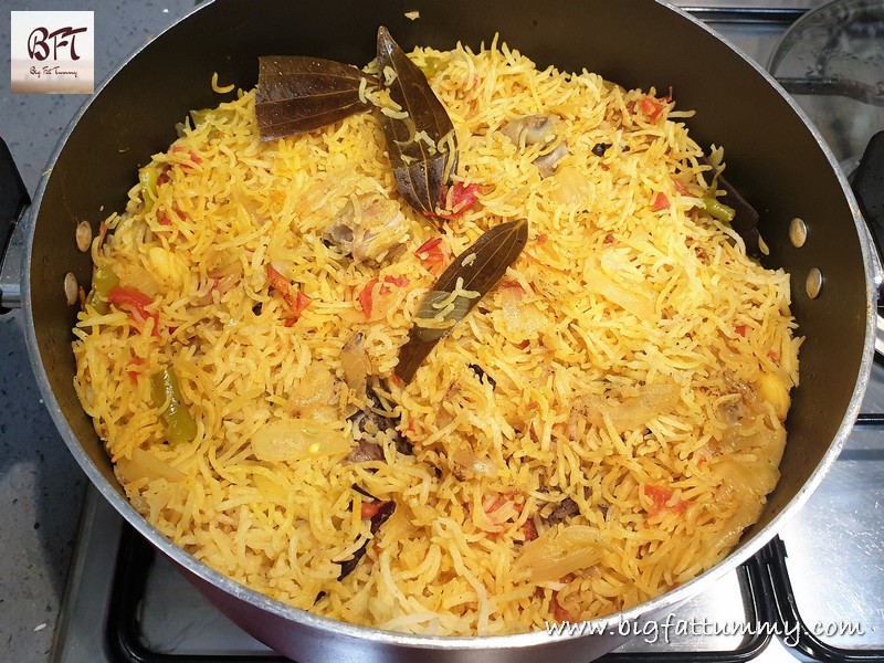 Step 8:     Add 1 tsp. salt, mix and check for taste. Add more if required. Sprinkle the garam masala and cook covered on low heat for 15 to 18 minutes till the rice and the chicken is cooked.