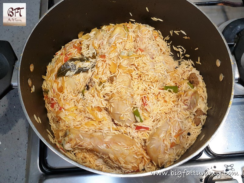 Step 7: Drain the rice and add to the vessel. Mix lightly so that the grain is coated with the masalas. Then add 3 ½ cups of hot water, the crushed stock cubes and let the mixture come to a boil.