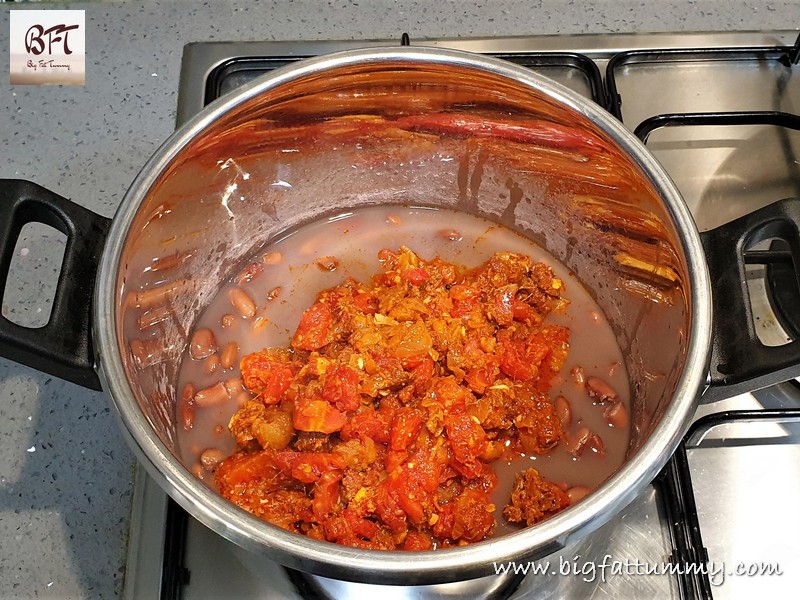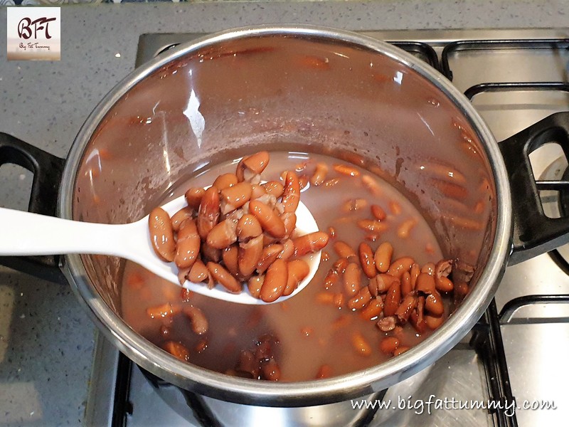 Step 1: Soak the rajma overnight in sufficient water. The next day, drain and pressure cook the rajma with 3 cups of water and the salt for 4 to 5 whistles till the rajma is cooked but not mushy.