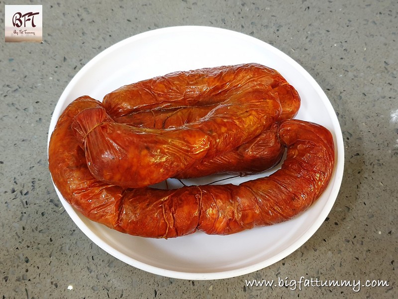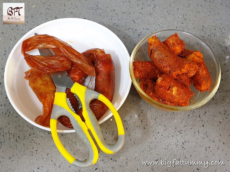 Step 2: While the rajma is cooking remove the string and skin / case of the sausages and place the sausage meat in a heavy bottomed vessel. Add ½ cup water and cook covered for 10 minutes on low heat till the oil / fat surfaces.