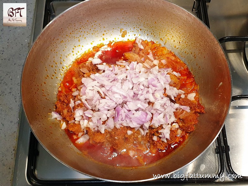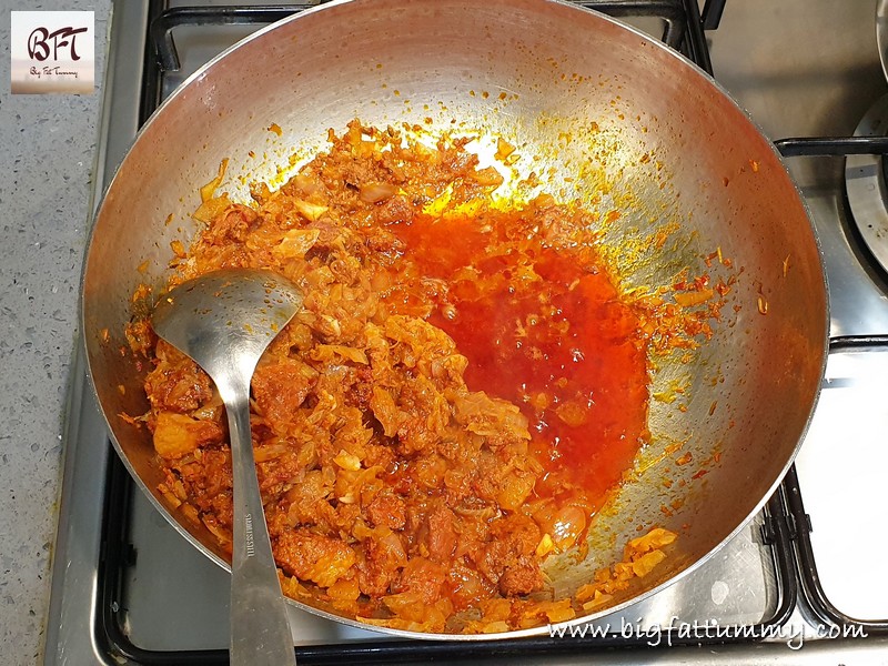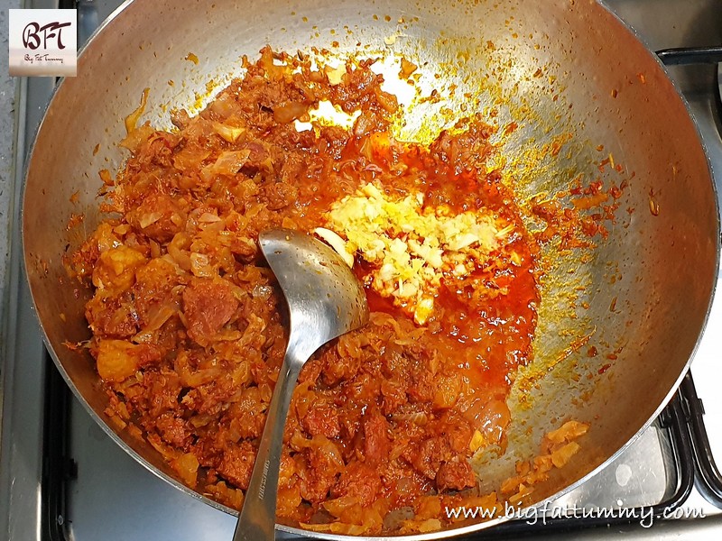 Step 3: Add the chopped onion to the vessel with the cooked sausages and sauté for 8 to 10 minutes on low heat. Then push the sausage-onion mixture to one side of the vessel. Add the ginger-garlic to the oil that’s collected on the other side and sauté for 2 to 3 minutes.