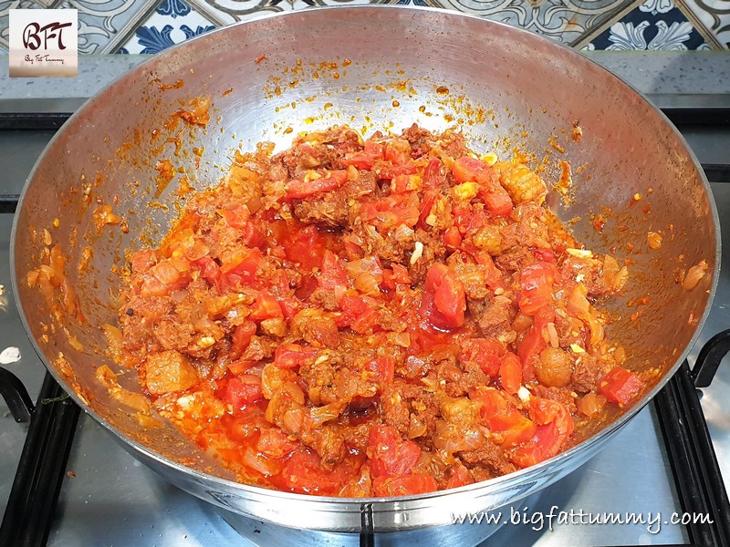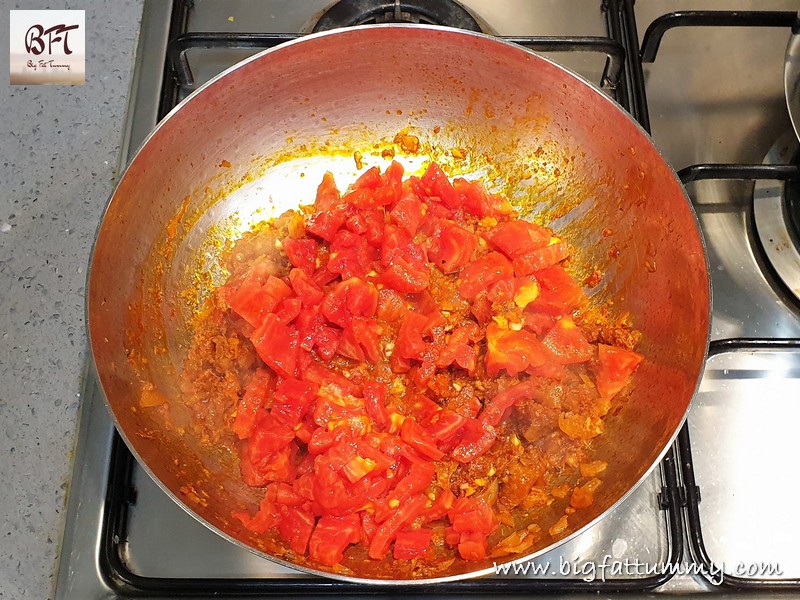 Step 4: Now add the tomatoes to the sausage mixture and cook uncovered on low heat for 10 minutes. Switch off the heat.