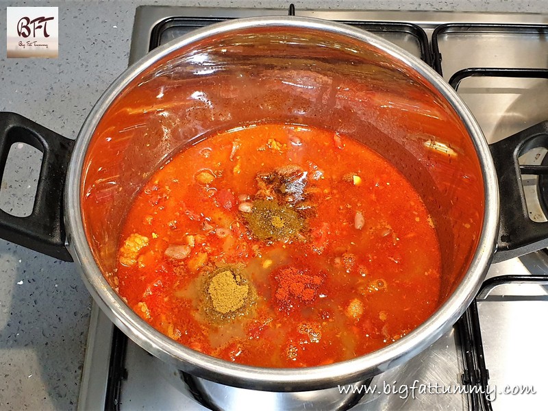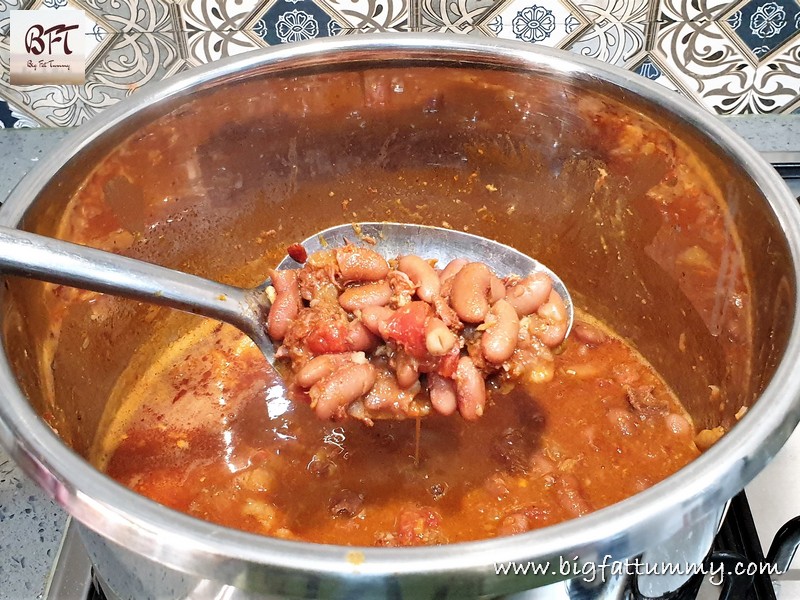 Step 5: Your beans will also have cooked by now. Open the pressure cooker and add the sausage mixture to the beans. Mix and add the powdered masalas. Mix again and bring to a boil on medium heat.