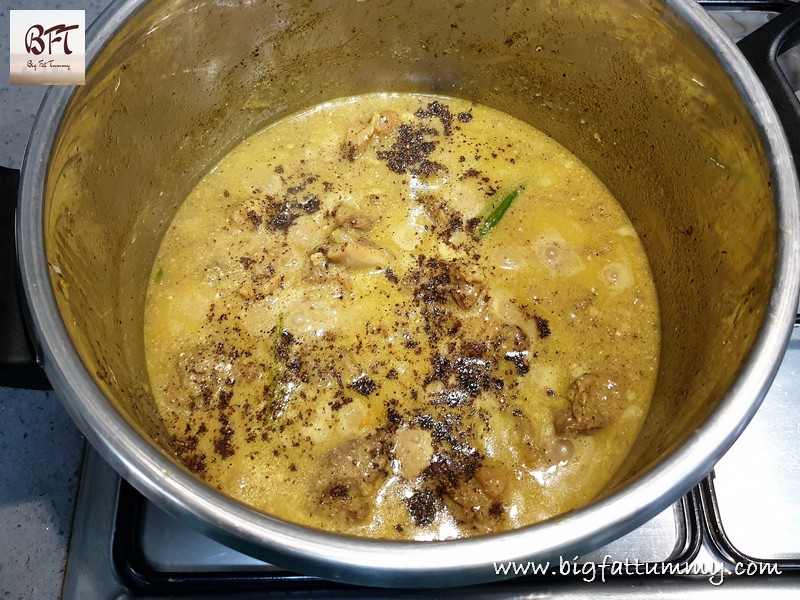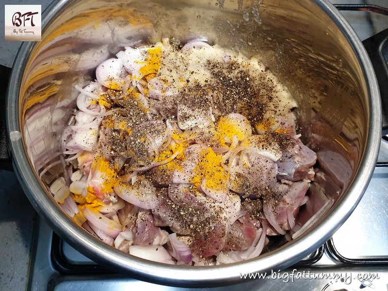 Step 1: Wash and drain the mutton pieces well. Transfer to a pressure cooker and add 1 ½ tsp. salt, the turmeric powder, 3 tsp. pepper powder, ginger-garlic paste and the sliced onion and mix well.