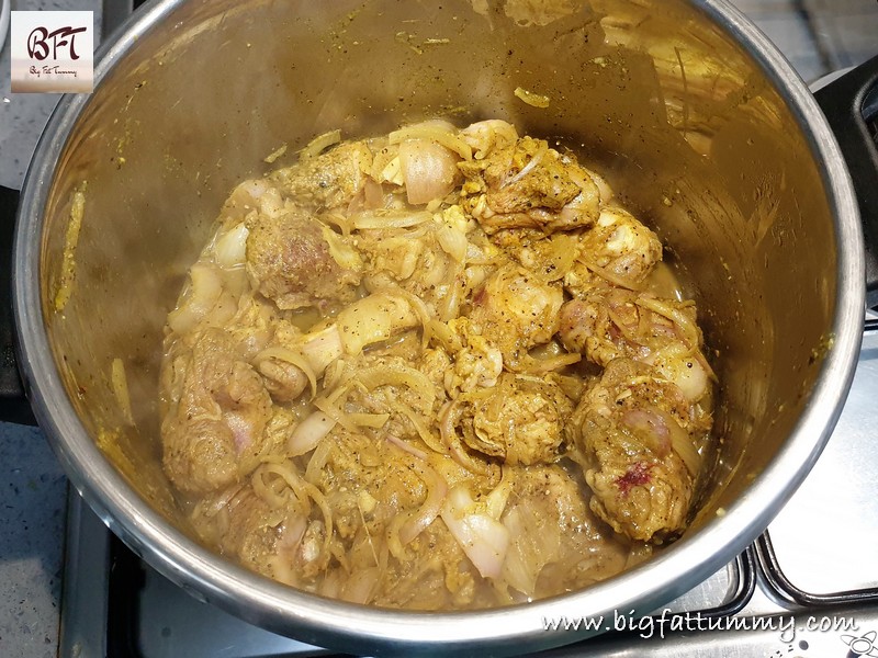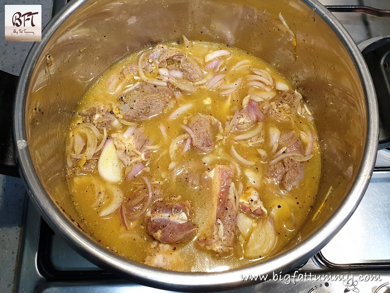 Step 2: Place the pressure cooker uncovered on medium heat and cook till the colour of the mutton changes (turning over once or twice in between). This should take 8 to 10 minutes.
