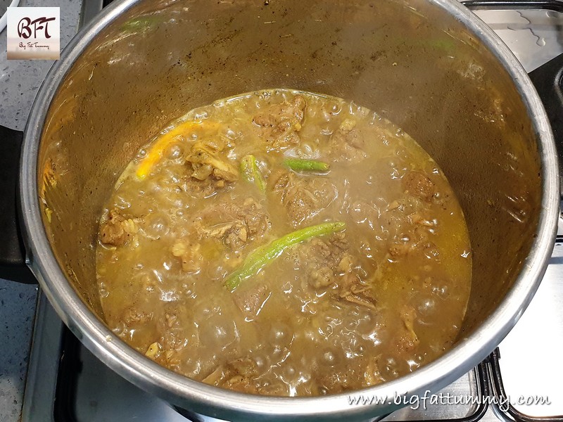 Step 3: Now add 150 ml hot water, close the lid of the pressure cooker and cook on high heat till the 1st whistle. Then cook on low heat for 20 minutes. Later, switch off the heat and allow the pressure to release naturally. Open the lid. The mutton should be cooked and tender.