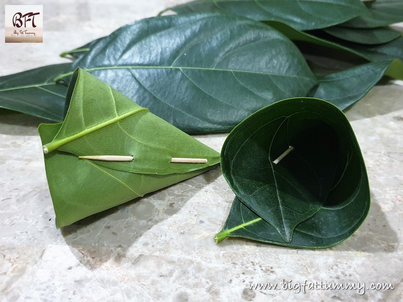 Step 3:     Wash and wipe the leaves. Then take each leaf and form a cone as shown in the picture. Attach it with a toothpick.