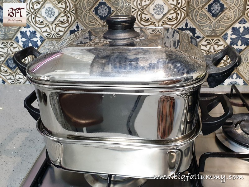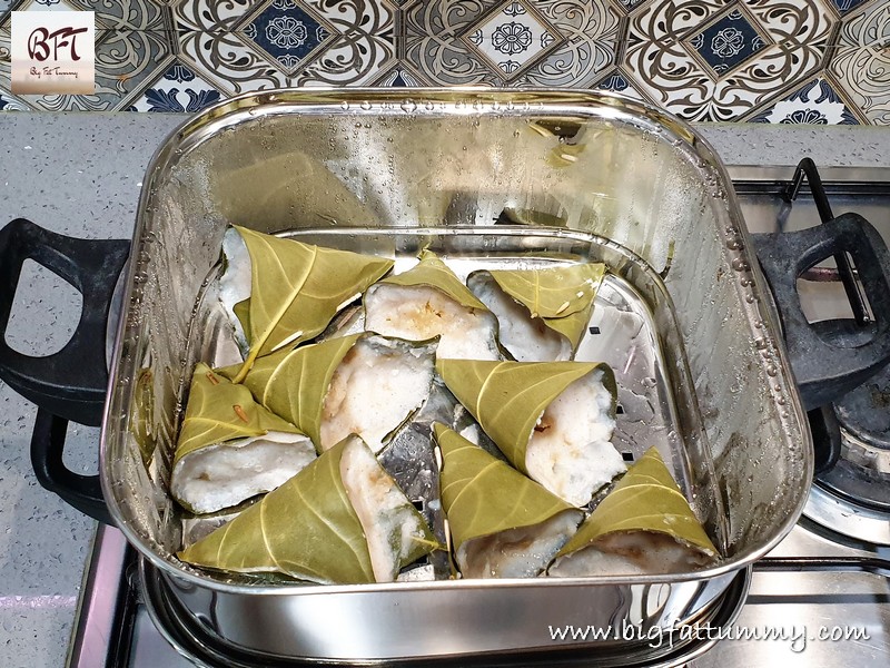 Step 6:     Put enough water in a steamer and cover it. Let the water come to a boil. When steam starts escaping, open the steamer and place the holles in it. Cover and steam for 15 to 20 minutes on medium low heat till the holles are done (the colour of the leaves changes).