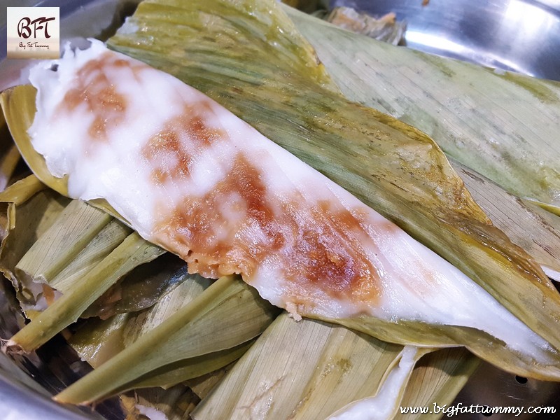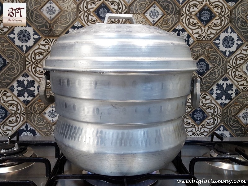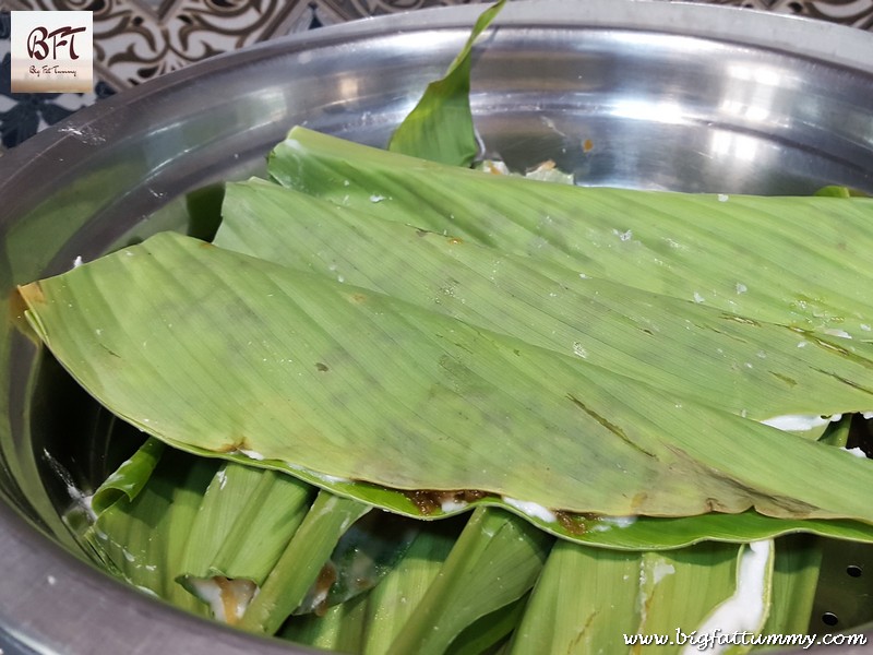 Step 7: Put enough water in a steamer and cover it. Let the water come to a boil. When steam starts escaping, open the steamer and place the patoleos in it. Cover and steam for 15 to 20 minutes on medium low heat till the patoleos are done (the colour of the leaves changes).