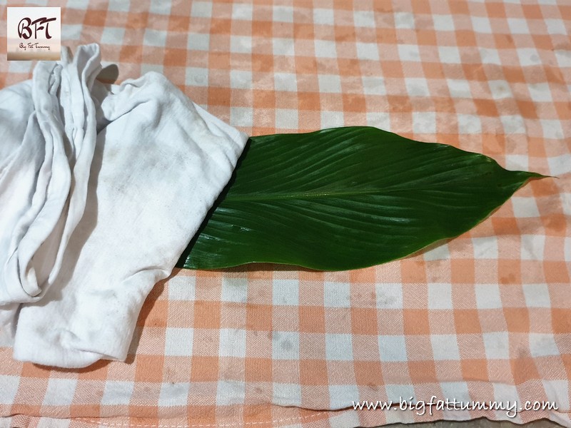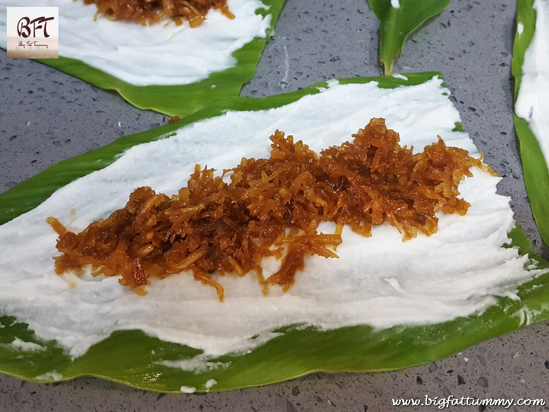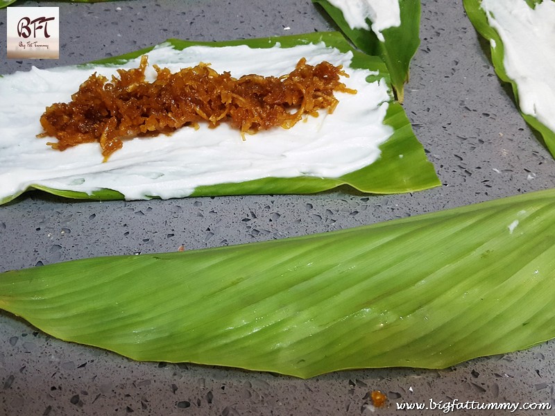Step 5: Take some of the rice dough and spread it all over the leaf in a thin and even layer.