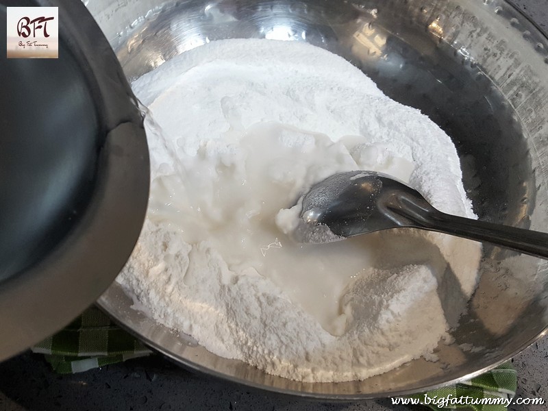 Step 2: Take the basmati flour in a bowl and add the boiling water to it. Stir with a spoon till all the flour comes together and a dough is formed.