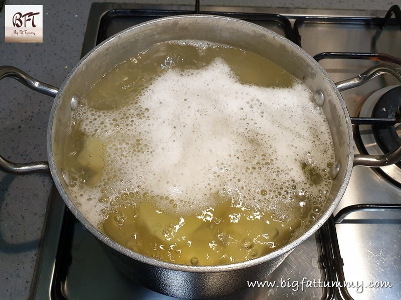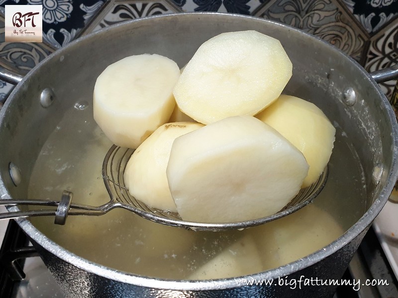 Step 4: Wash the potatoes well to remove any dirt. Peel the potatoes, halve them and boil them in a large pot (Add potatoes, salt and cook till done but not mashy – fork tender).