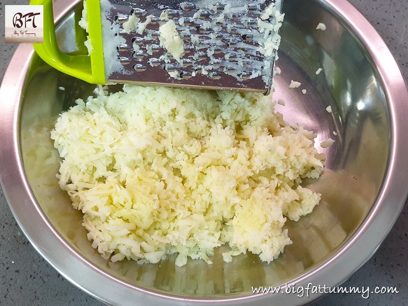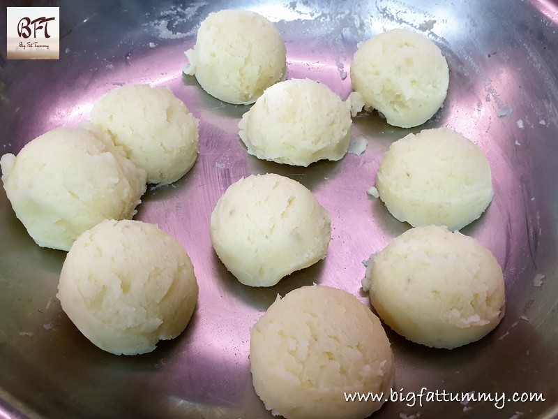 Step 5: Remove / strain the cooked potatoes and place them on a large plate. Grate the potatoes whilst still hot / warm. Add the butter and then knead the grated potatoes with your knuckles so that there are no lumps and a smooth dough / mash is formed. Check for salt and add to taste.