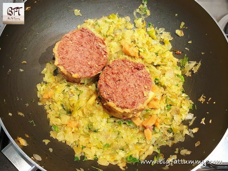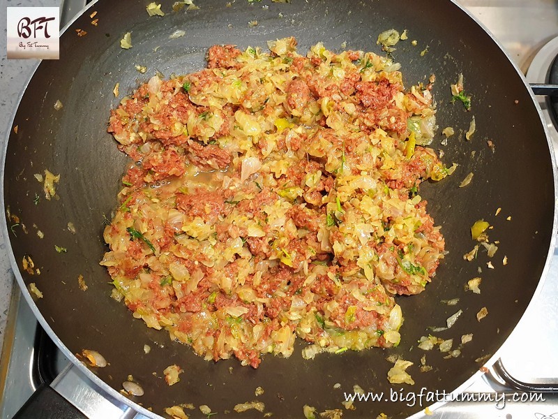 Step 3: Add the corned beef. Mash and sauté for 2 minutes. Add ½ tsp. salt and cook covered for 3 to 4 minutes on low heat. Then open the lid and add the vinegar. Mix and continue cooking till most of the moisture dries out. Add the pepper, mix and keep aside.