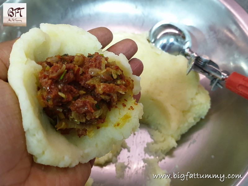 Step 7: Place a portion of the potato mash on your clean palm. Flatten it slightly and place 1 tbsp. of the corned beef filling in the center of the flattened mash. Then bring the edges together to completely cover the filling and shape it gently into a ball. Do this for all the portions.