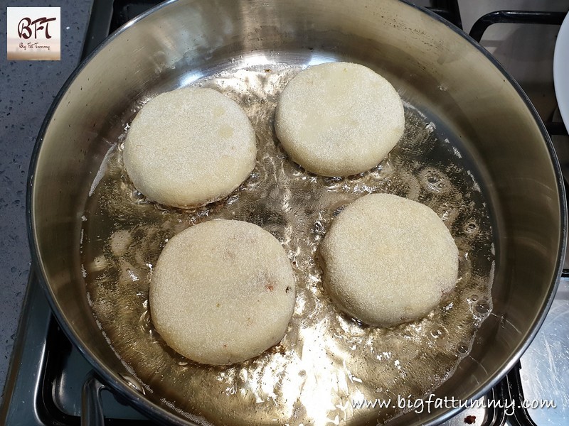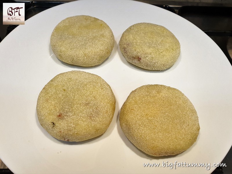 Step 9: Dip each potato chop in the beaten egg to coat it completely and then coat with the rawa. Place in a single layer in a container / plate and cover with cling film. Refrigerate for an hour or deep freeze till you want to fry them.