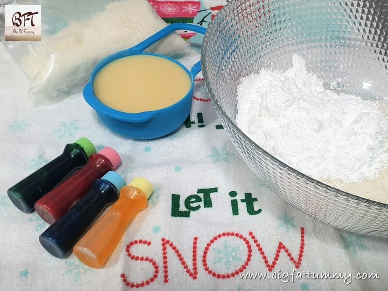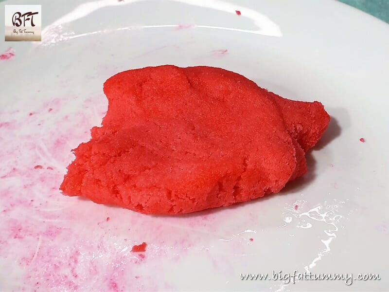 Step 2: Divide the dough into 3 equal portions. Take a plate and dust it with a little icing sugar. Take one portion of the dough on the plate and top it with a drop or two of food colour and knead to blend well (add another drop if you’re not satisfied with the colour or like a darker shade). Do this with different colours for all the portions of dough.