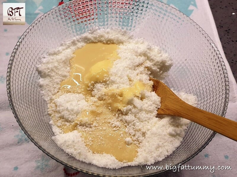 Step 1: Take the icing sugar and dessicated coconut in a big bowl. Add the condensed milk and mix to form a dough.