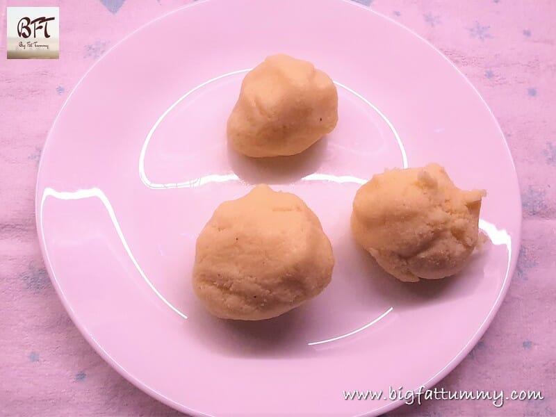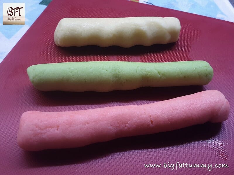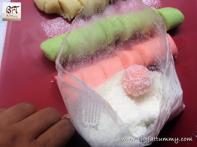 Step 3: Take each coloured dough ball and roll it into a cylindrical shape (see pic). Then cut the cylinder into equal portions. Roll each portion into smooth round balls.