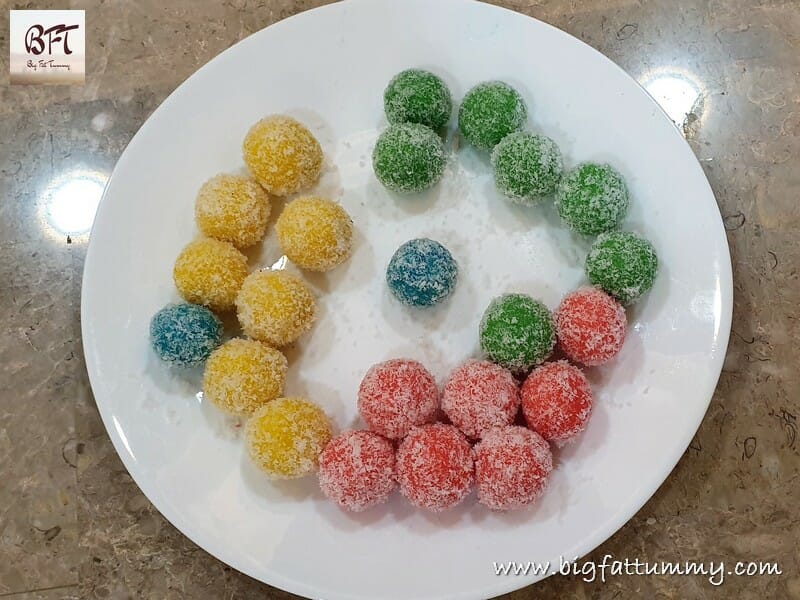 The recipe for Coconut Ice Snowballs does not involve any cooking. The recipe is actually of coconut ice (click here). It’s like the coconut ice has warped into little round colourful balls and now look more appealing and presentable. This recipe is perfect for the lazy lethargic cherub you can sometimes be.