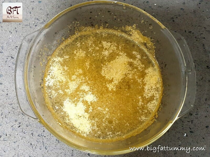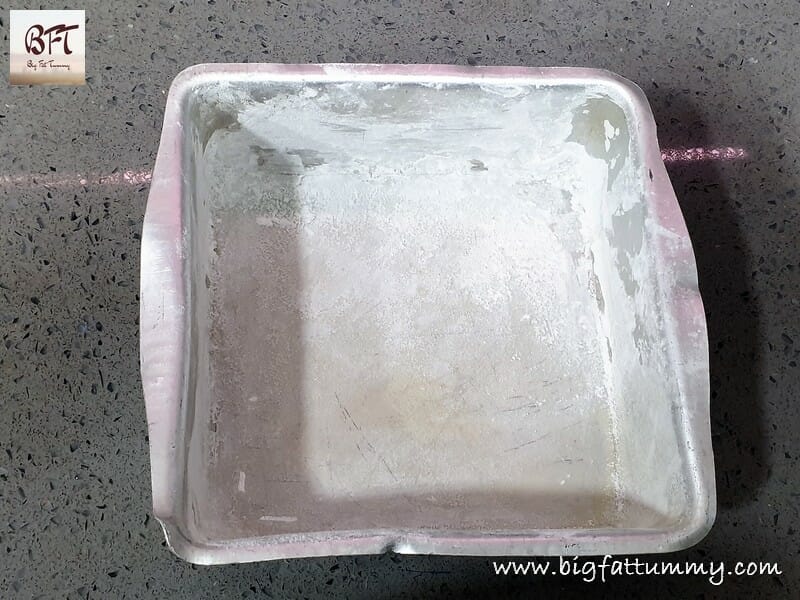 Step 1:     Take a 6 inch square pan and grease with oil and then dust with corn flour. Keep aside.