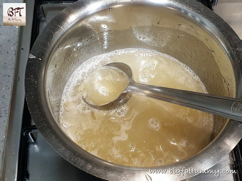 Step 3:     Take the sugar and 120 ml water in a pan and boil till a thick syrup is formed and the sugar dissolves. Stir in the gelatin and continue boiling whilst lifting the liquid with a spatula continuously.