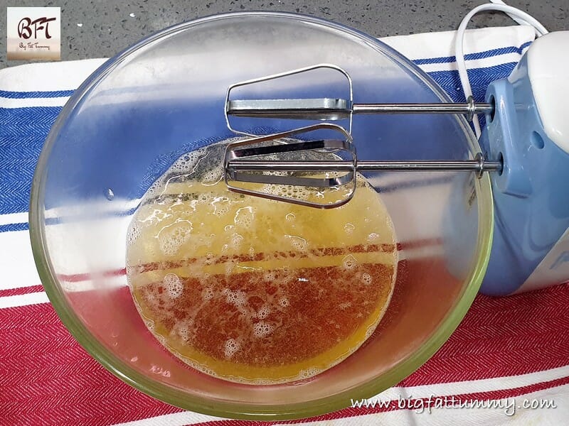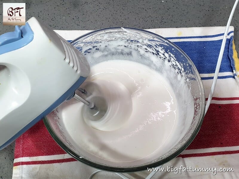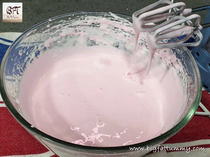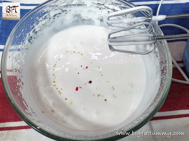 Step 6:     Use an electric beater and beat till the cooked mixture turns thick and white in colour. Then add the food colour and essence and beat till you get a thick ribbon like texture.