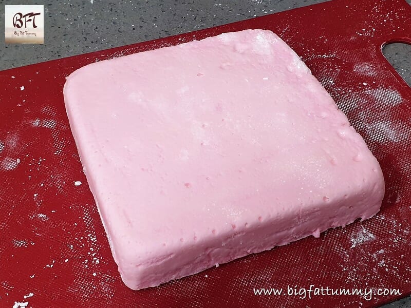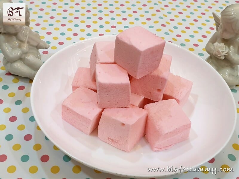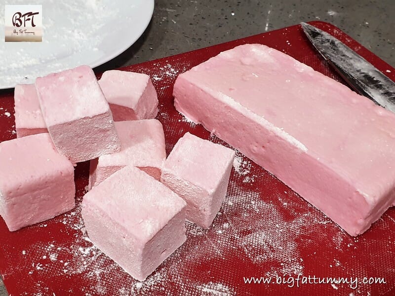 Step 8:     The next day, dust a chopping board with corn flour and lightly coat the top layer. Gently demould the set marshmallow mixture onto it. Lightly dust a sharp knife with corn flour and cut into cubes. Take a plate with some corn flour in it and coat the cubes of marshmallows lightly. Dust off excess flour. Your marshmallows are ready!