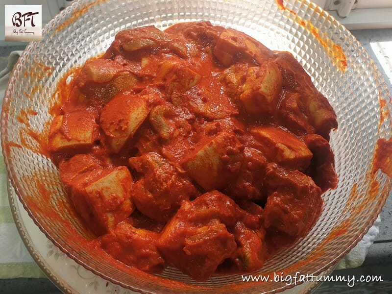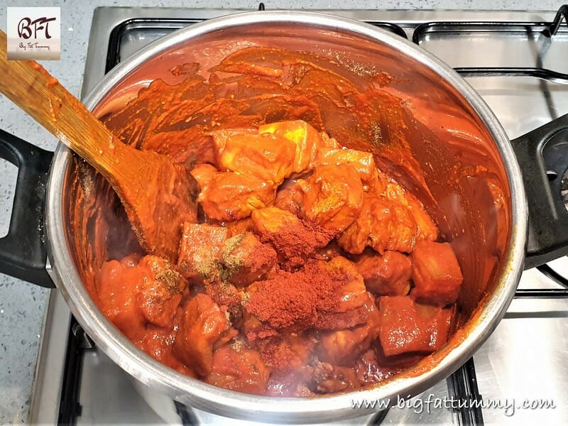 Step 3: Add this paste to the pre-marinated pork. Also add the whole cloves, cinnamon, pepper corns and coat all the pieces well. Cover the bowl with cling film and leave to marinate overnight or at least 2 hours in the refrigerator.