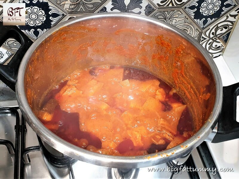 Step 6: Add 400 ml hot water to the pork and cook covered on low heat for about 60 minutes till the meat is done.