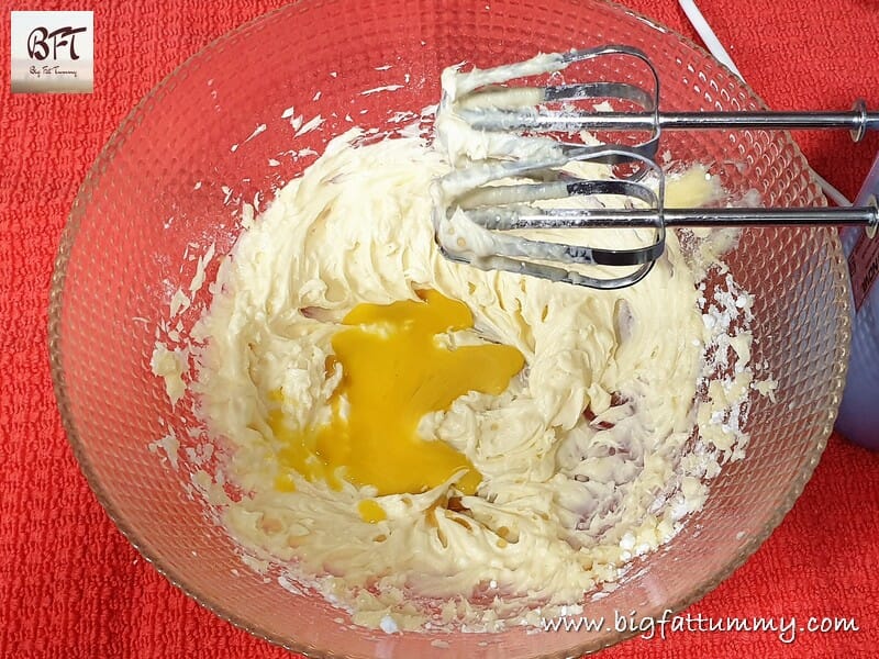 Step 3: Take the butter and powdered sugar in a bowl and cream till light using a hand mixer. Add the egg yolk and vanilla essence and mix.