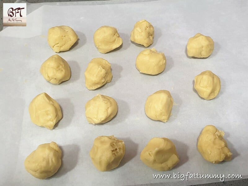 Step 6: Later, remove from the refrigerator and scoop ½ tbsp., each time, and form small balls. Place on your baking tray lined with parchment paper and press lightly with the heel of you palm to form the cookie. Do this till you use up all of the dough.